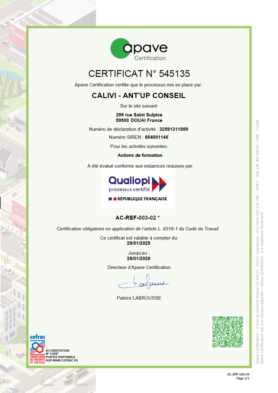 Certificat Qualiopi n°545135 (Télécharger le Certificat)